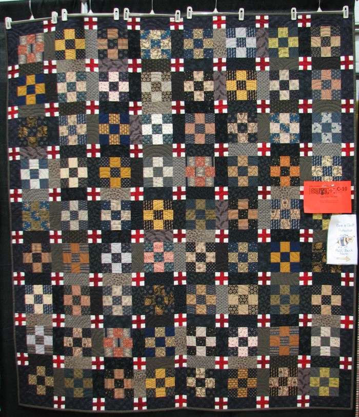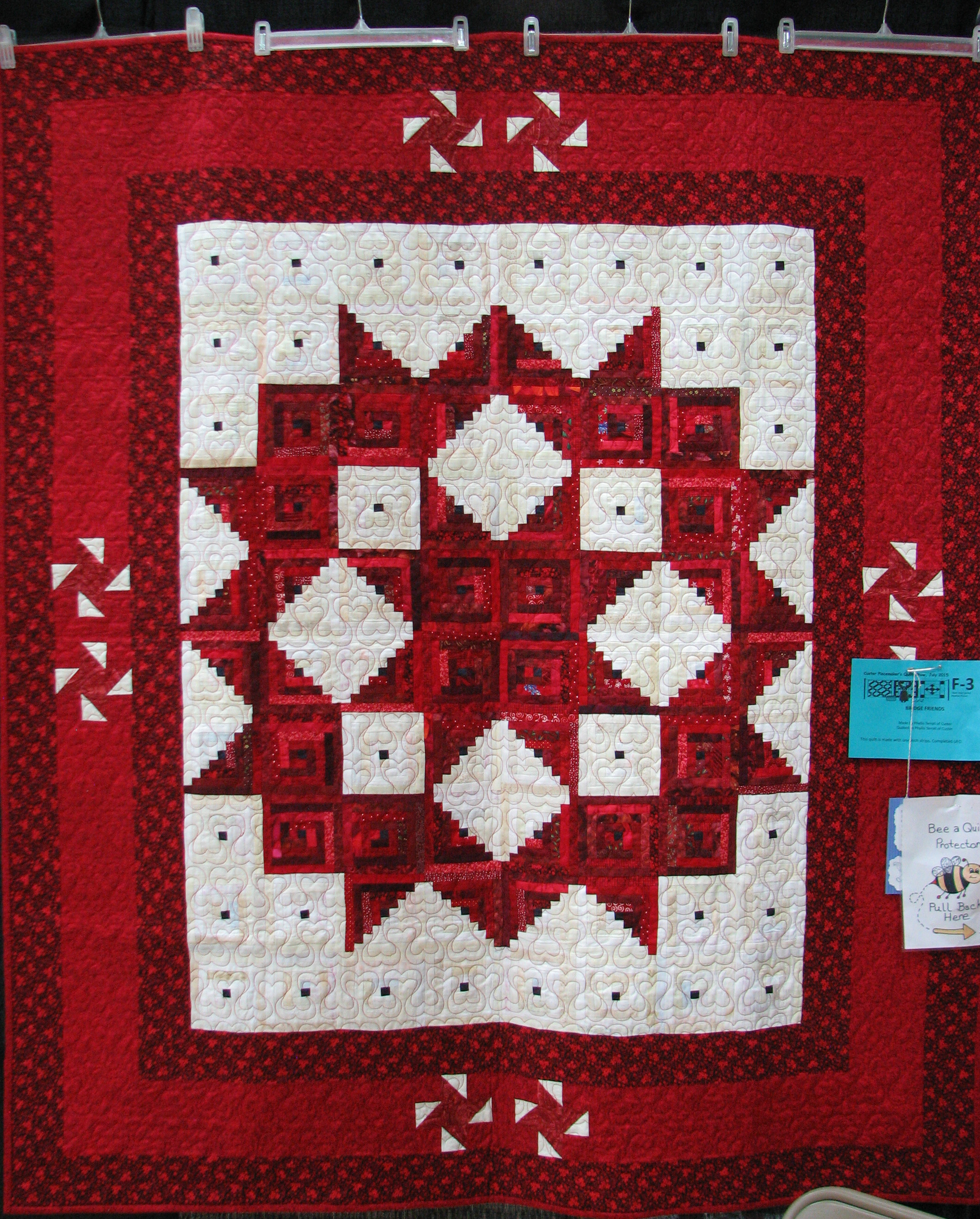 “Bridge Friends” by Phyllis Terrall. A great color scheme log cabin made with one-inch strips. Impressive scale